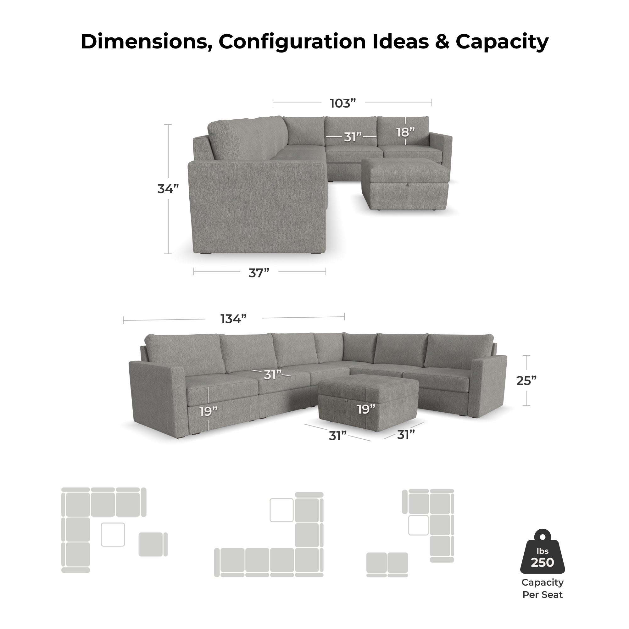 CONFIGUREDesigned for a lifetime of flexibility, the Flex 6-seat sectional with storage ottoman delivers reconfigurable relaxation for small and large groups. Use the ottoman as a standalone piece or combine with other the other modular components to create the perfect seating arrangement for your space. Built with Blue Steel Spring technology and sustainable, stain-resistant performance fabric, Flex seating provides deep-seated, blissful comfort and long-lasting livability. And assembly is a breeze with a patented J-Bracket™ “no-tool” method that takes minutes, rather than hours.