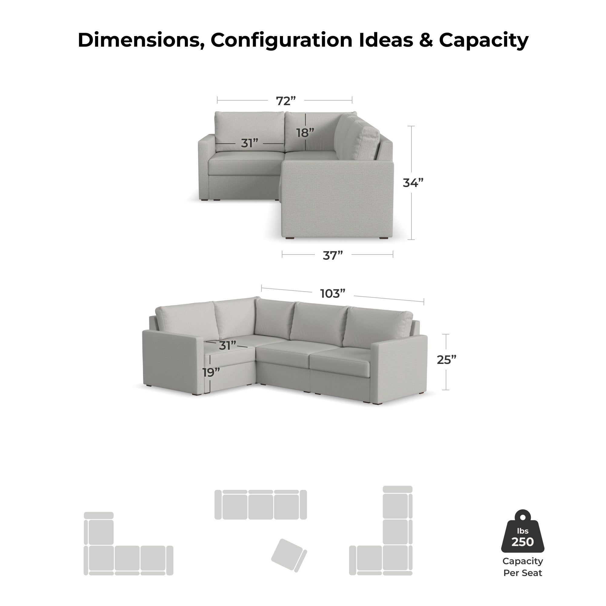 CONFIGUREDesigned for a lifetime of flexibility, the Flex 4-seat sectional supports the space you have now and can easily expand when your home does. Modular components allow a multitude of configurations so you can create the perfect seating arrangement. Built with Blue Steel Spring technology and sustainable, stain-resistant performance fabric, Flex seating provides deep-seated, blissful comfort and long-lasting livability. And assembly is a breeze with a patented J-Bracket™ “no-tool” method that takes minutes, rather than hours.