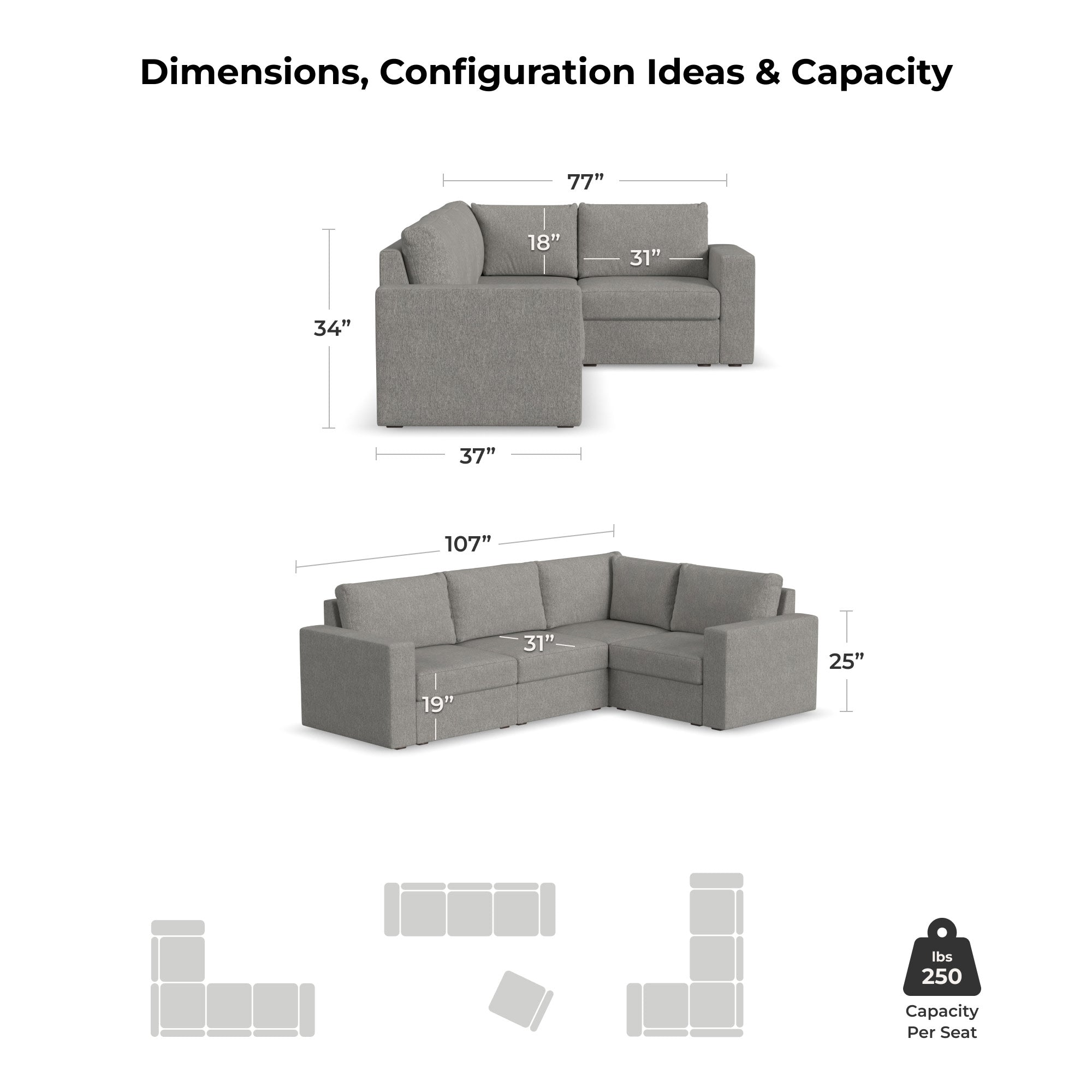 Designed for a lifetime of flexibility, the Flex 4-seat sectional supports the space you have now and can easily expand when your home does. Modular components allow a multitude of configurations so you can create the perfect seating arrangement. Built with Blue Steel Spring technology and sustainable, stain-resistant performance fabric, Flex seating provides deep-seated, blissful comfort and long-lasting livability. And assembly is a breeze with a patented J-Bracket™ “no-tool” method that takes minutes, rather than hours.