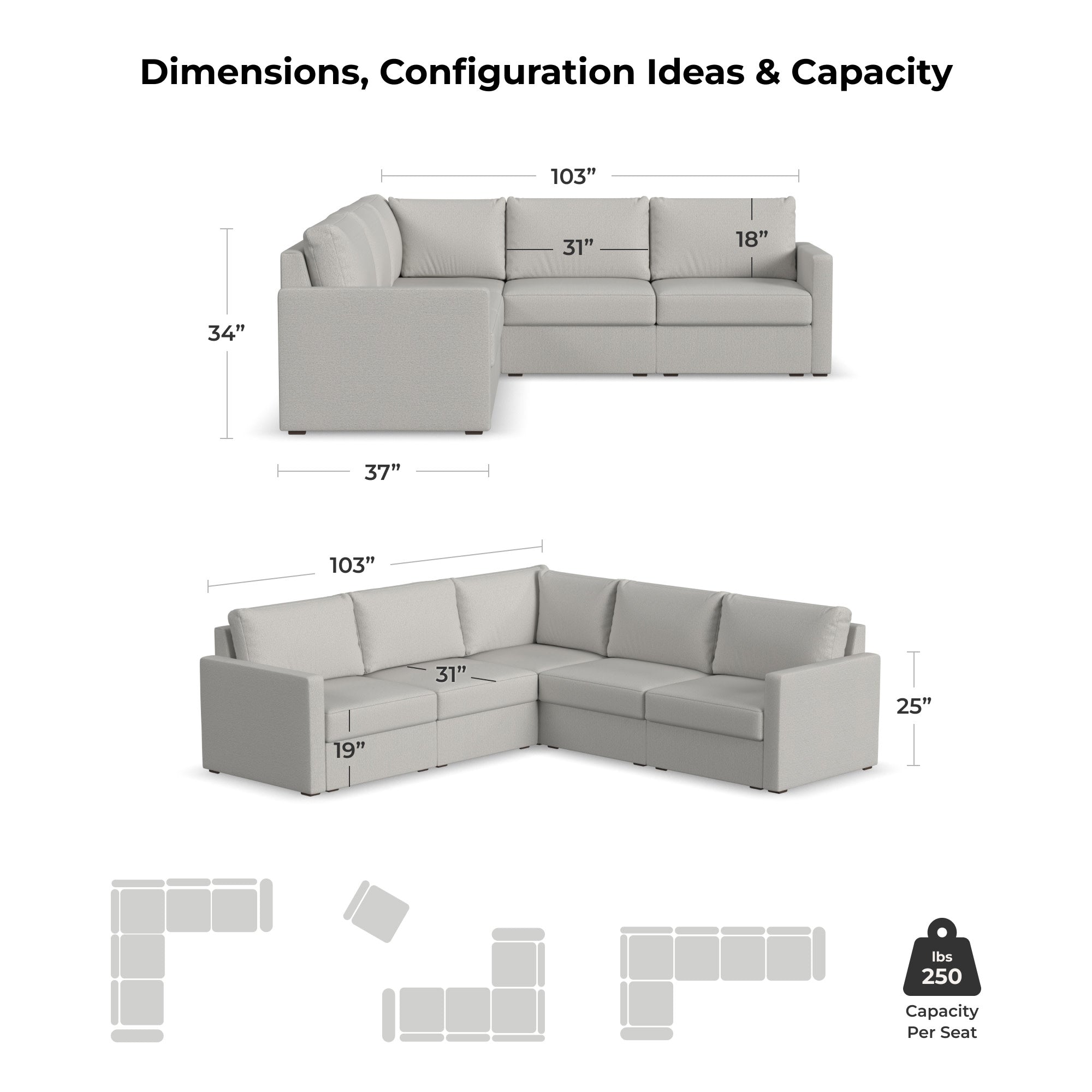CONFIGUREDesigned for a lifetime of flexibility, the Flex 5-seat sectional supports the space you have now and can easily expand when your home does. Modular components allow a multitude of configurations so you can create the perfect seating arrangement. Built with Blue Steel Spring technology and sustainable, stain-resistant performance fabric, Flex seating provides deep-seated, blissful comfort and long-lasting livability. And assembly is a breeze with a patented J-Bracket™ “no-tool” method that takes minutes, rather than hours.