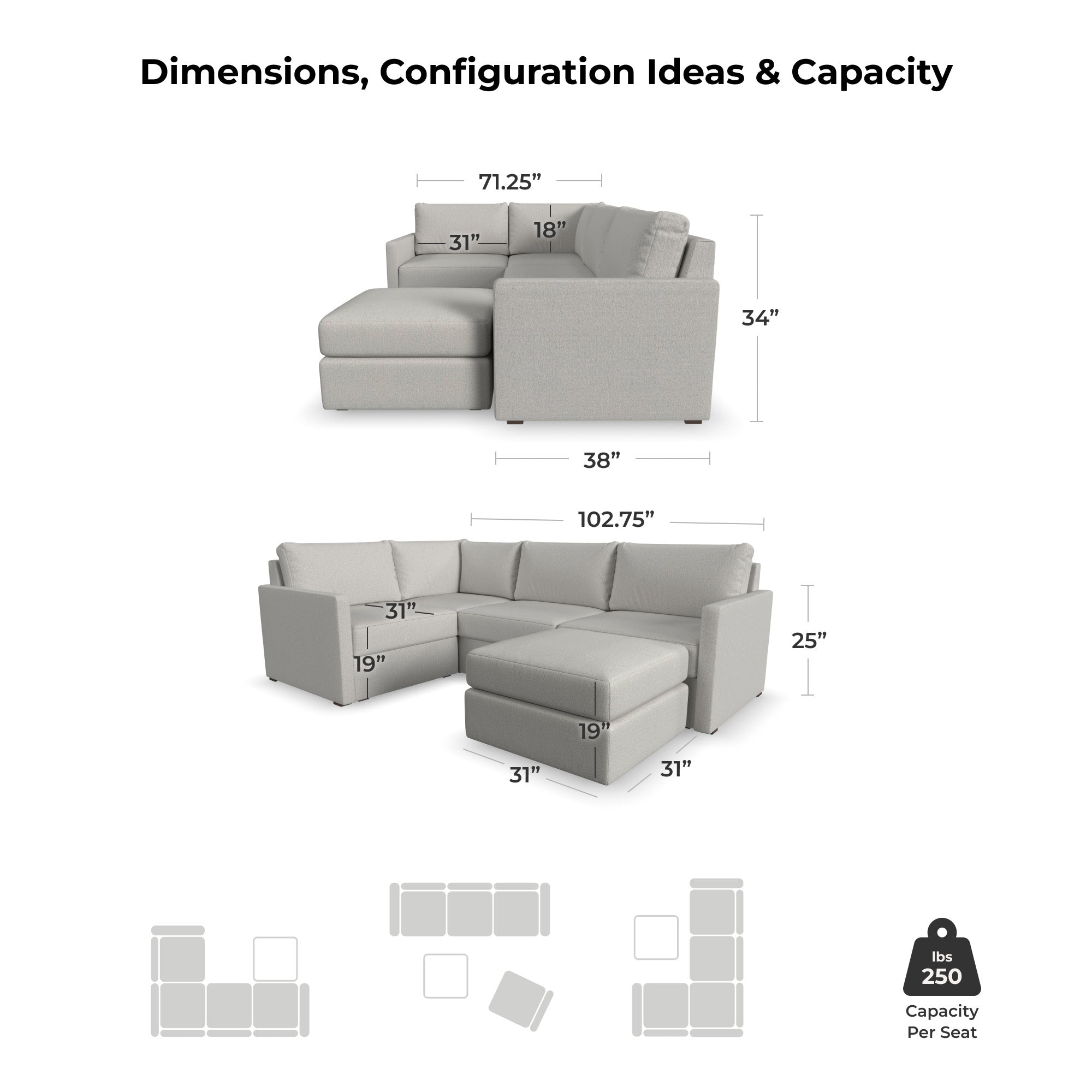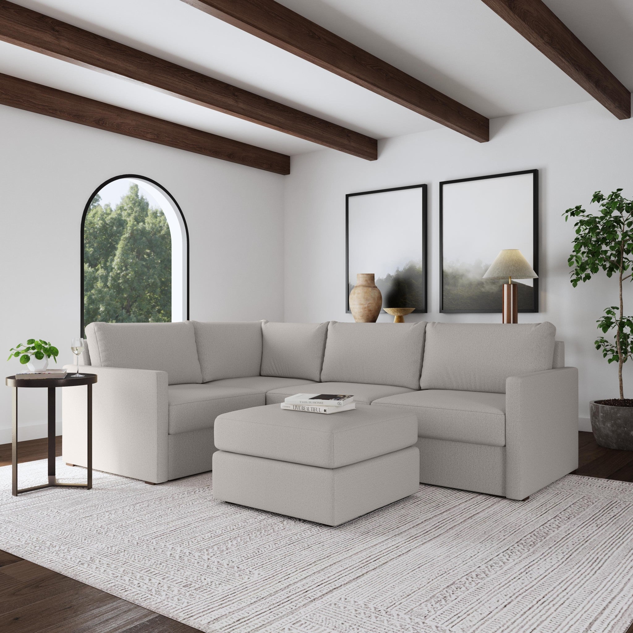 Designed for a lifetime of flexibility, the Flex 4-seat sectional with ottoman can easily contract or expand as your needs change. Use the ottoman as a standalone piece or combine with other the other modular components to create the perfect seating configuration for your space. Built with Blue Steel Spring technology and sustainable, stain-resistant performance fabric, Flex seating provides deep-seated, blissful comfort and long-lasting livability. And assembly is a breeze with a patented J-Bracket™ “no-tool” method that takes minutes, rather than hours.