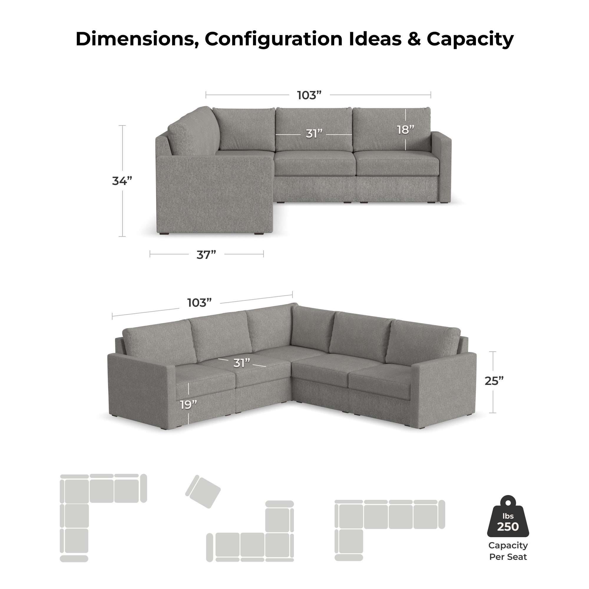 Designed for a lifetime of flexibility, the Flex 5-seat sectional supports the space you have now and can easily expand when your home does. Modular components allow a multitude of configurations so you can create the perfect seating arrangement. Built with Blue Steel Spring technology and sustainable, stain-resistant performance fabric, Flex seating provides deep-seated, blissful comfort and long-lasting livability. And assembly is a breeze with a patented J-Bracket™ “no-tool” method that takes minutes, rather than hours.