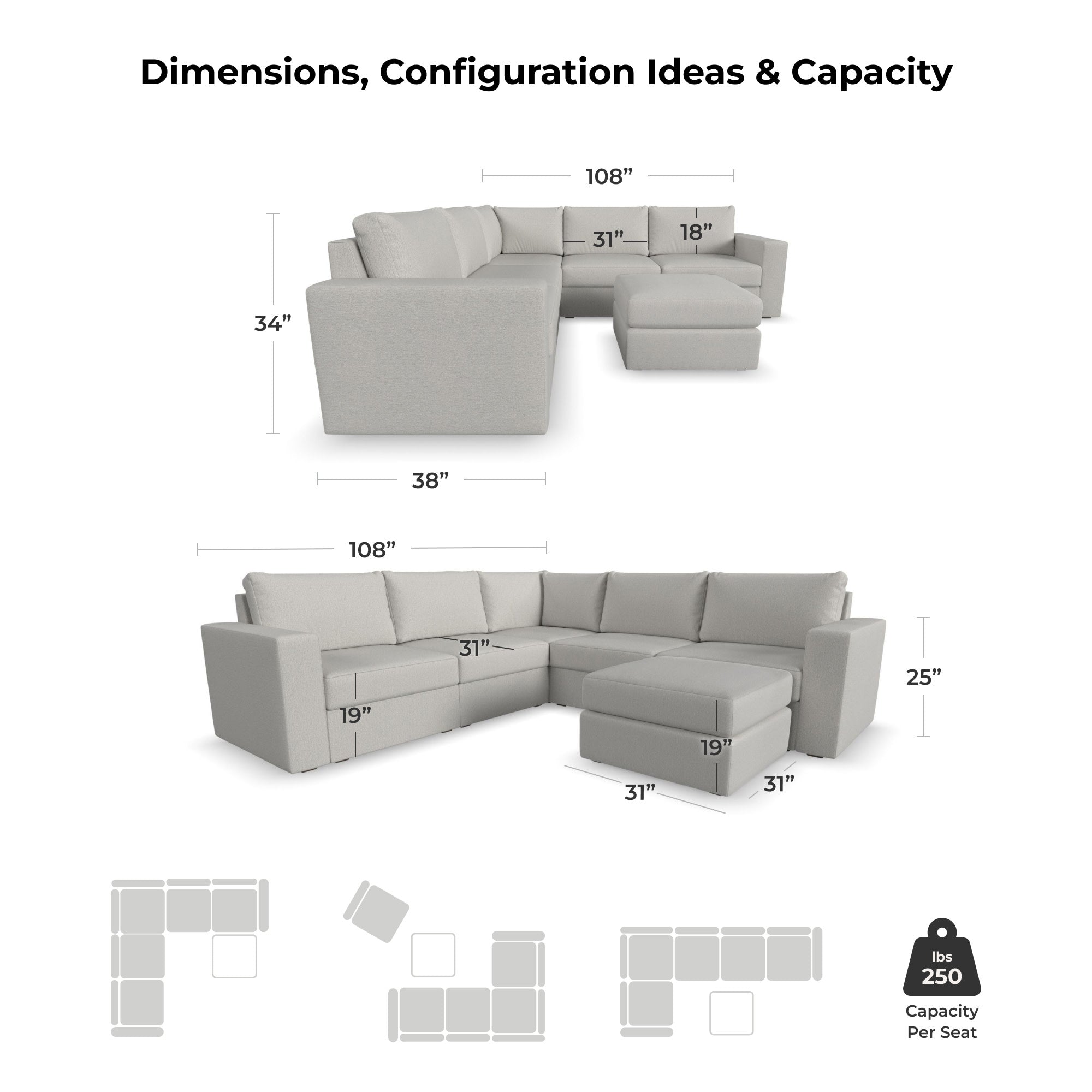 Designed for a lifetime of flexibility, the Flex 5-seat sectional with ottoman can easily contract or expand as your needs change. Use the ottoman as a standalone piece or combine with other the other modular components to create the perfect seating configuration for your space. Built with Blue Steel Spring technology and sustainable, stain-resistant performance fabric, Flex seating provides deep-seated, blissful comfort and long-lasting livability. And assembly is a breeze with a patented J-Bracket™ “no-tool” method that takes minutes, rather than hours.