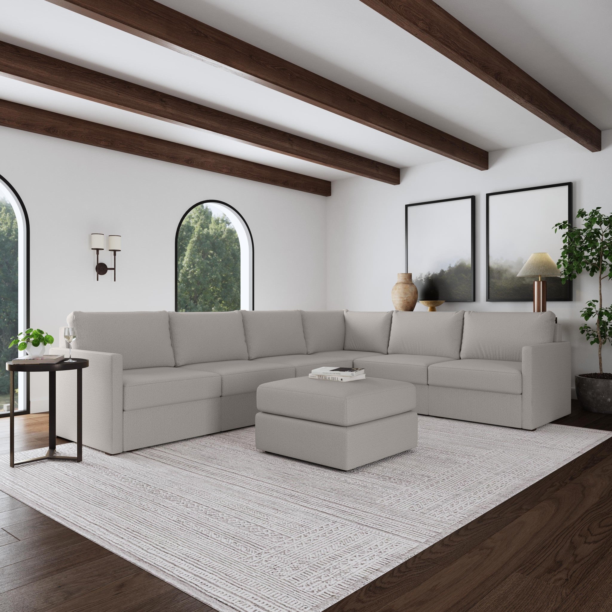 Designed for a lifetime of flexibility, the Flex 6-seat sectional with ottoman delivers reconfigurable relaxation for small and large groups. Use the ottoman as a standalone piece or combine with other the other modular components to create the perfect seating arrangement for your space. Built with Blue Steel Spring technology and sustainable, stain-resistant performance fabric, Flex seating provides deep-seated, blissful comfort and long-lasting livability. And assembly is a breeze with a patented J-Bracket™ “no-tool” method that takes minutes, rather than hours.
