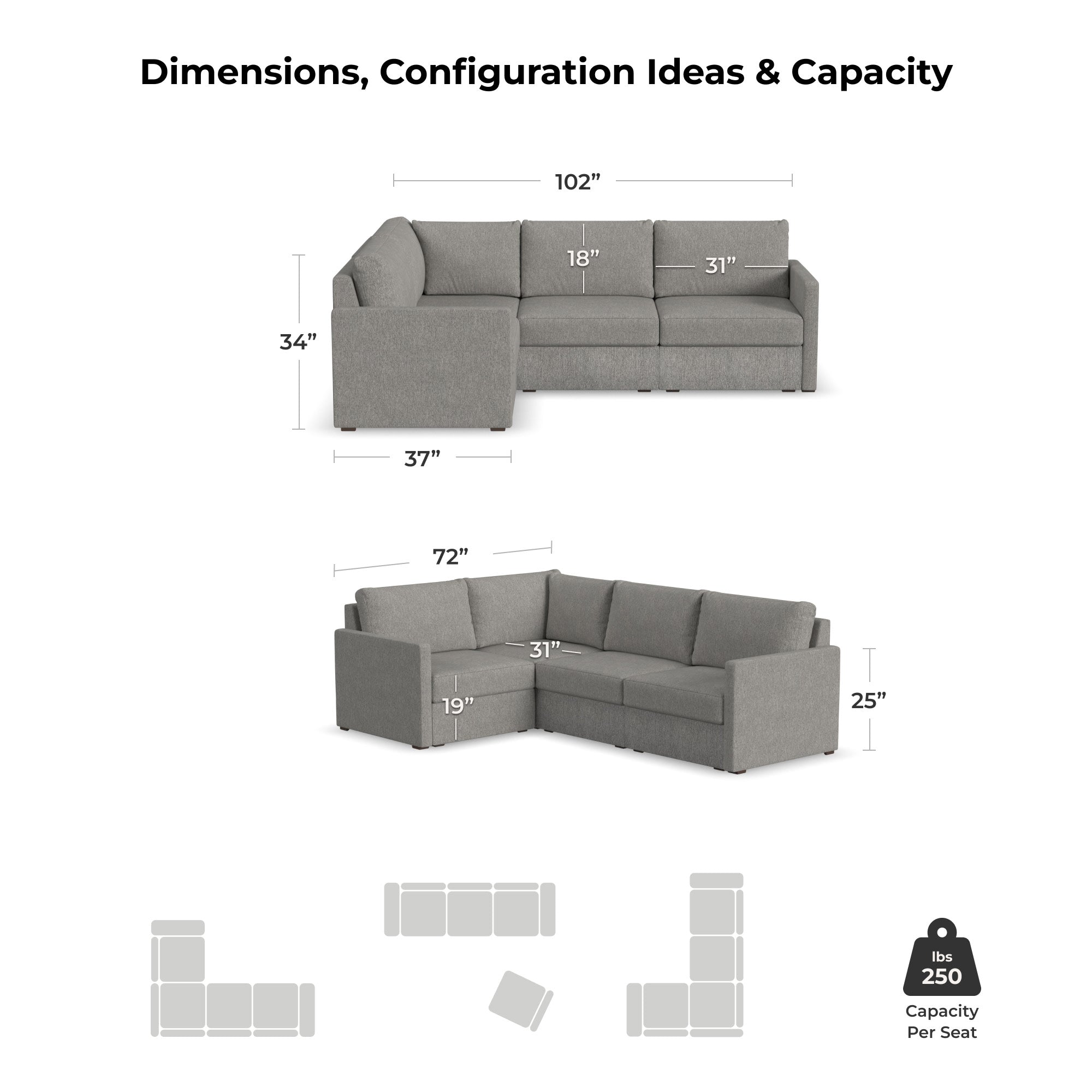 Designed for a lifetime of flexibility, the Flex 4-seat sectional supports the space you have now and can easily expand when your home does. Modular components allow a multitude of configurations so you can create the perfect seating arrangement. Built with Blue Steel Spring technology and sustainable, stain-resistant performance fabric, Flex seating provides deep-seated, blissful comfort and long-lasting livability. And assembly is a breeze with a patented J-Bracket™ “no-tool” method that takes minutes, rather than hours.