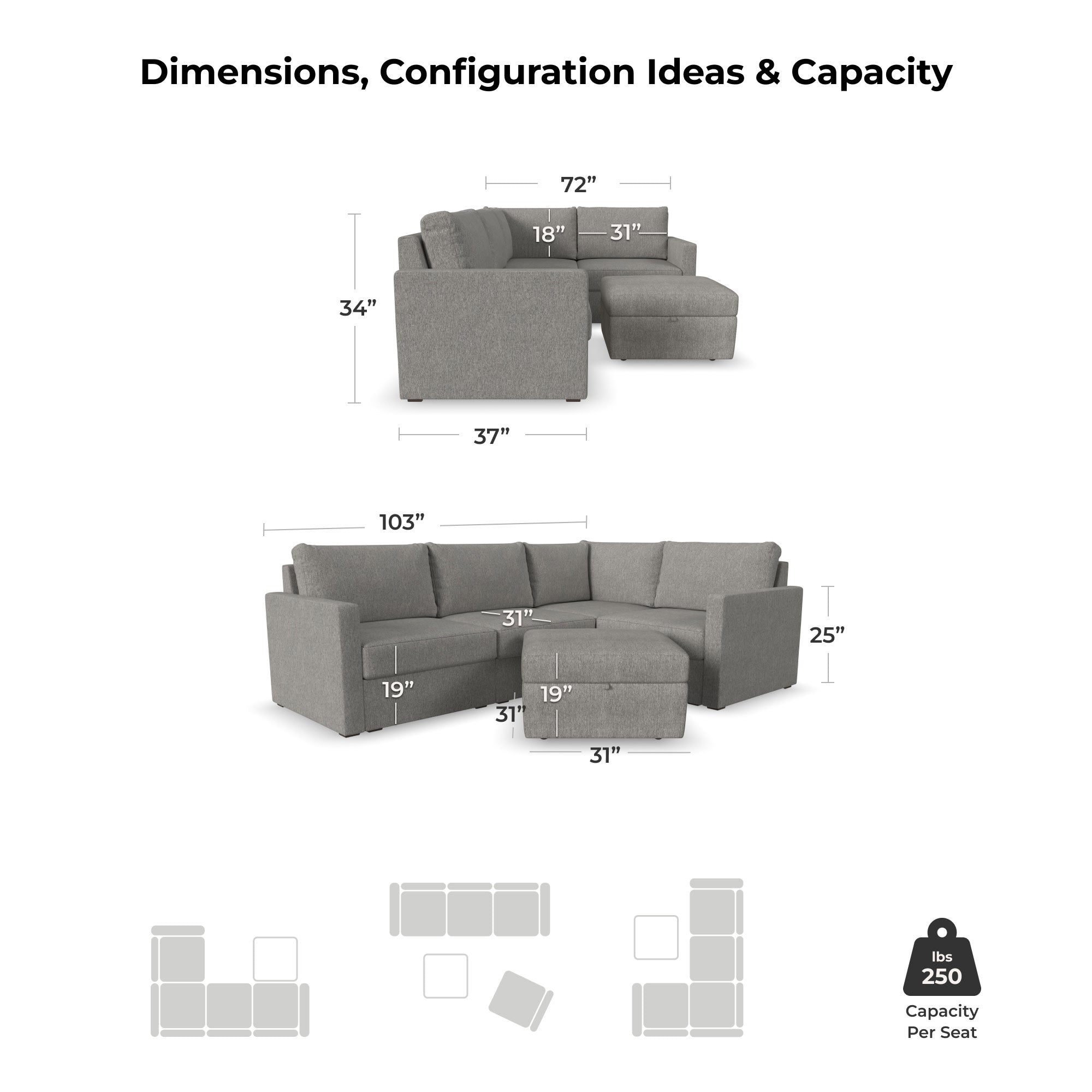 Designed for a lifetime of flexibility, the Flex 4-seat sectional with storage ottoman can easily contract or expand as your needs change. Use the ottoman as a standalone piece or combine with other the other modular components to create the perfect seating configuration for your space. Built with Blue Steel Spring technology and sustainable, stain-resistant performance fabric, Flex seating provides deep-seated, blissful comfort and long-lasting livability. And assembly is a breeze with a patented J-Bracket™ “no-tool” method that takes minutes, rather than hours.