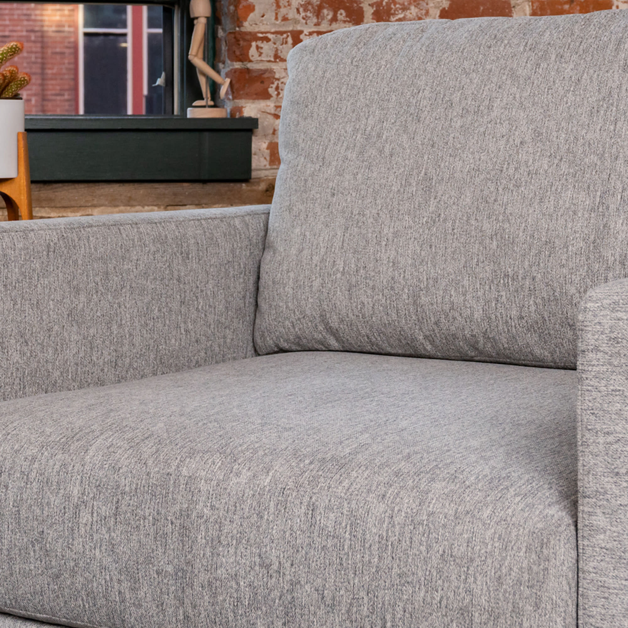 • Upholstered in a gray performance fabric that is sustainably made with recycled water bottles and delivers exceptional stain- and water-resistance for easy cleanability, making it the perfect choice for active families and pets