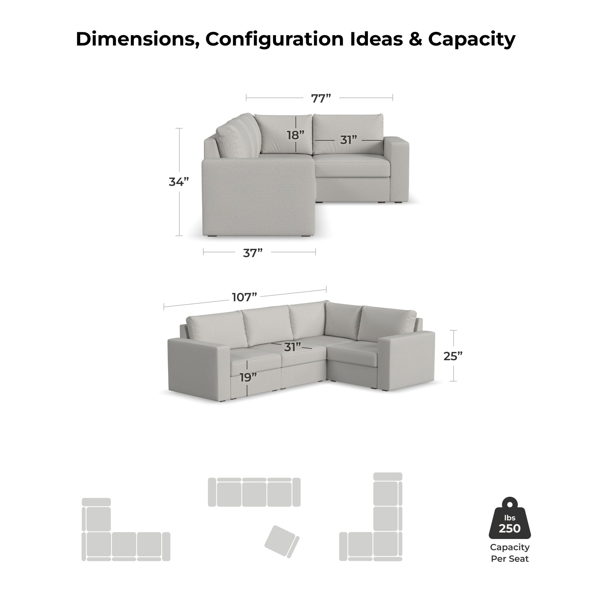 Designed for a lifetime of flexibility, the Flex 4-seat sectional supports the space you have now and can easily expand when your home does. Modular components allow a multitude of configurations so you can create the perfect seating arrangement. Built with Blue Steel Spring technology and sustainable, stain-resistant performance fabric, Flex seating provides deep-seated, blissful comfort and long-lasting livability. And assembly is a breeze with a patented J-Bracket™ “no-tool” method that takes minutes, rather than hours.