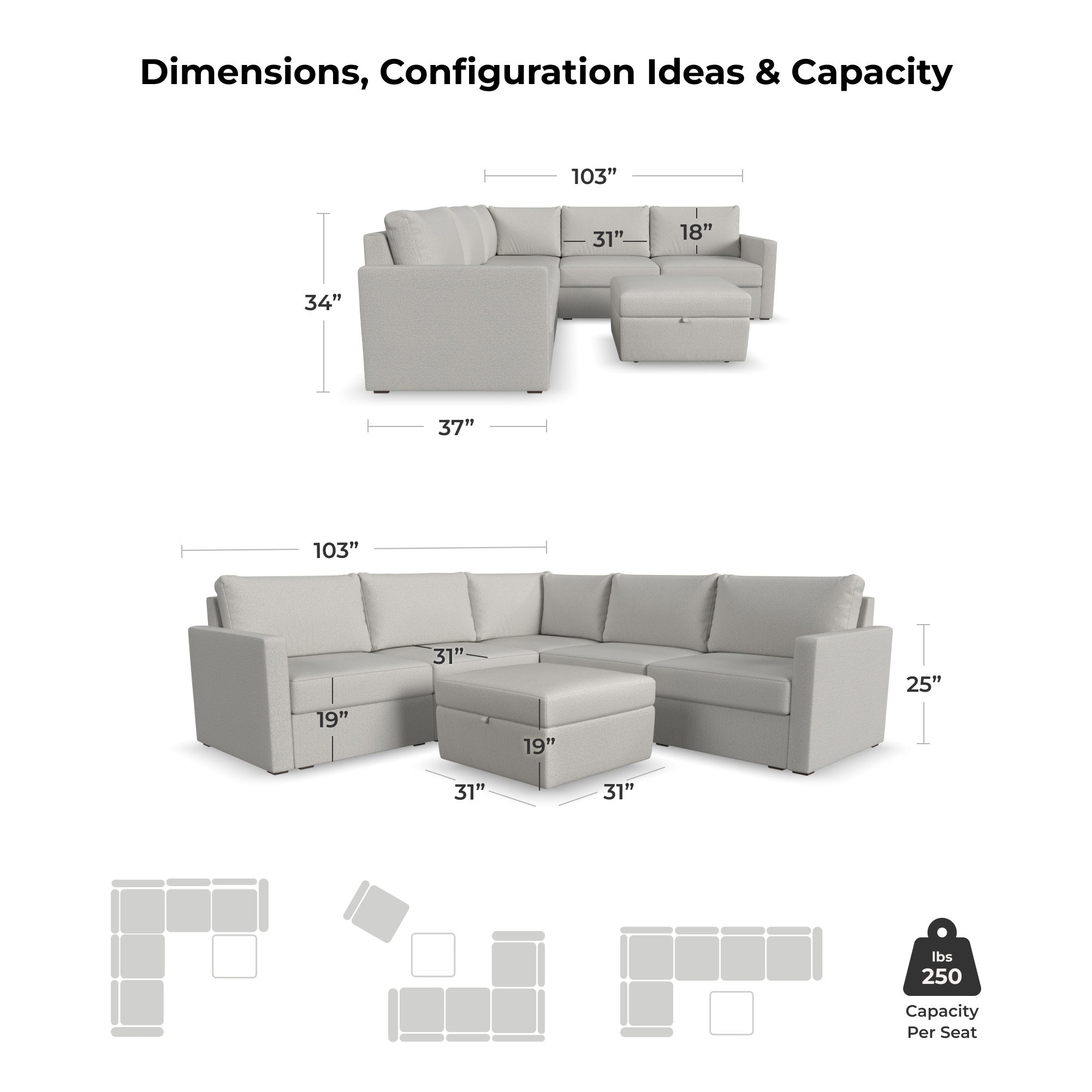 Designed for a lifetime of flexibility, the Flex 5-seat sectional with storage ottoman can easily contract or expand as your needs change. Use the ottoman as a standalone piece or combine with other the other modular components to create the perfect seating configuration for your space. Built with Blue Steel Spring technology and sustainable, stain-resistant performance fabric, Flex seating provides deep-seated, blissful comfort and long-lasting livability. And assembly is a breeze with a patented J-Bracket™ “no-tool” method that takes minutes, rather than hours.