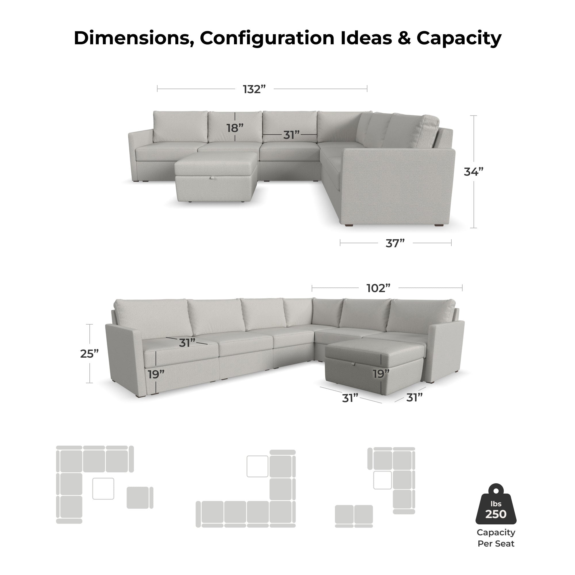 Designed for a lifetime of flexibility, the Flex 6-seat sectional with storage ottoman delivers reconfigurable relaxation for small and large groups. Use the ottoman as a standalone piece or combine with other the other modular components to create the perfect seating arrangement for your space. Built with Blue Steel Spring technology and sustainable, stain-resistant performance fabric, Flex seating provides deep-seated, blissful comfort and long-lasting livability. And assembly is a breeze with a patented J-Bracket™ “no-tool” method that takes minutes, rather than hours.