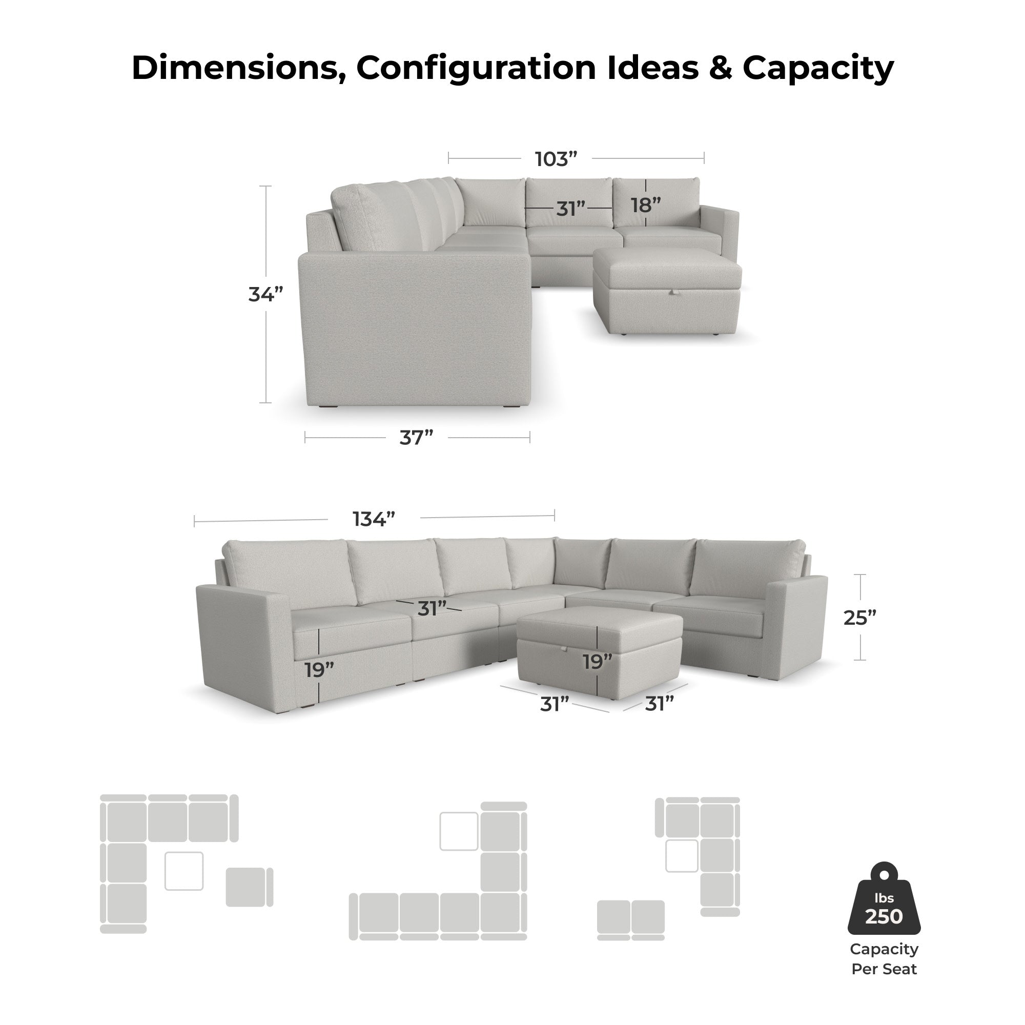 Designed for a lifetime of flexibility, the Flex 6-seat sectional with storage ottoman delivers reconfigurable relaxation for small and large groups. Use the ottoman as a standalone piece or combine with other the other modular components to create the perfect seating arrangement for your space. Built with Blue Steel Spring technology and sustainable, stain-resistant performance fabric, Flex seating provides deep-seated, blissful comfort and long-lasting livability. And assembly is a breeze with a patented J-Bracket™ “no-tool” method that takes minutes, rather than hours.